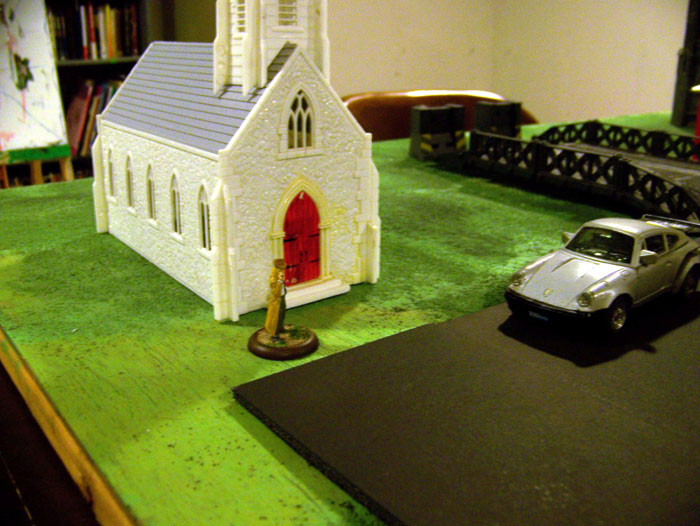 Here's the table setup, complete with a combination of O-Scale railroad, scratchbuilt, and some commercially made wargaming terrain. There's also a pop-culture icon making a cameo appearance.